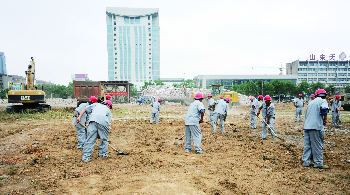 19日上午,记者在沂蒙革命纪念馆片区建筑工地看到,工作人员正在紧张施工。
