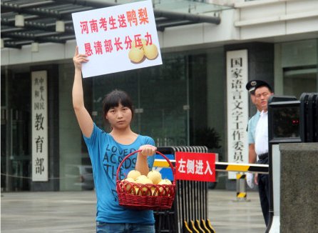 9月11日,来自河南的几个学生,来到位于北京西单附近的教育部,给教育部部长送鸭梨,“希望帮他们分担压力,取消高考户籍限制,提高外省录取比例。”结果鸭梨被委婉拒绝。图片:腾讯微博网友“砖家雷闯”